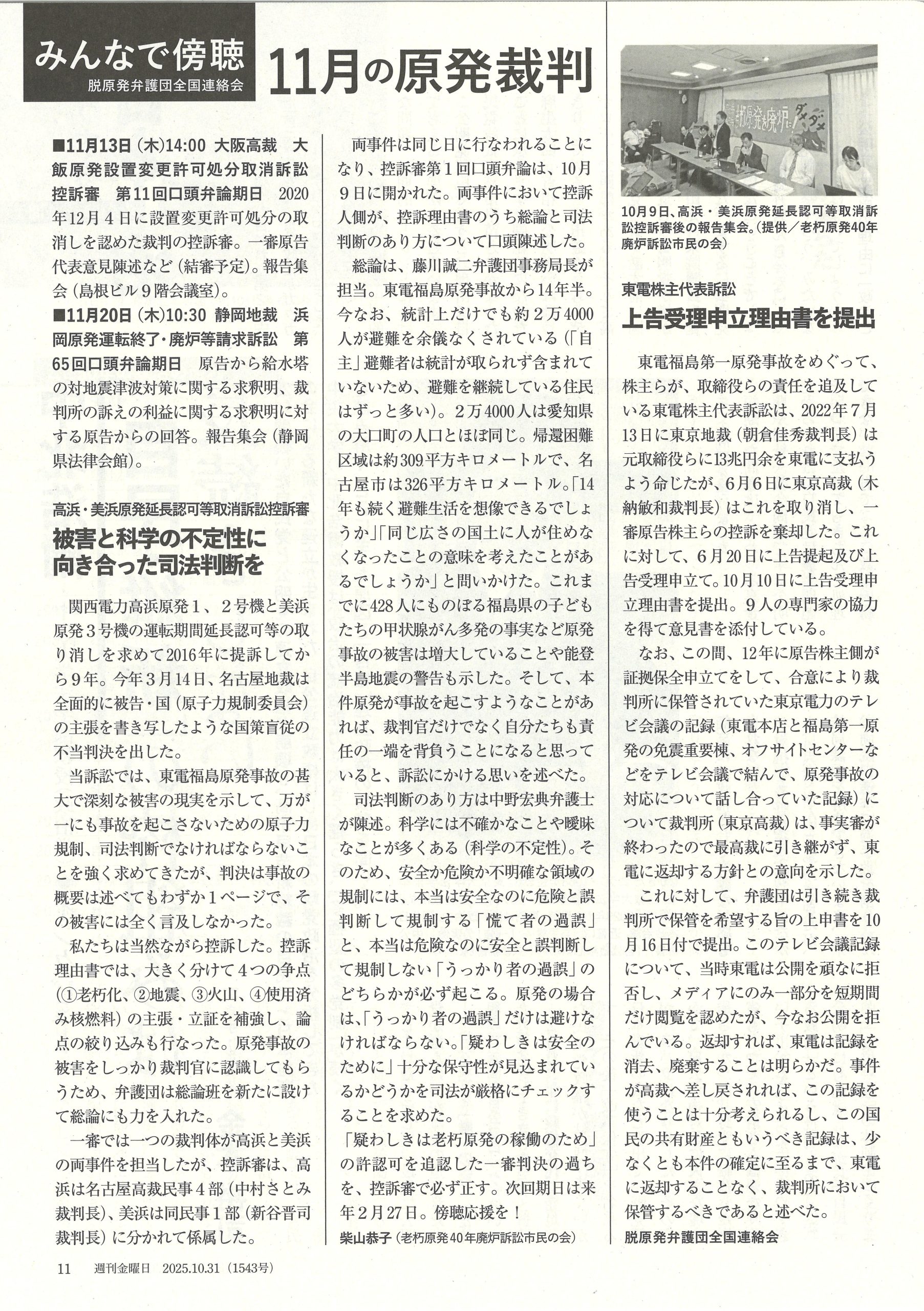 週刊金曜日の11月の原発裁判に掲載された、10月9日に開かれた、名古屋高裁での老朽高浜・美浜原発延長認可等取消訴訟の控訴審第1回口頭弁論期日の報告記事、「高浜・美浜原発延長認可等取消訴訟控訴審 被害と科学の不定性に向き合った司法判断を」について、転載いたします。東電株主代表訴訟の上告受理申立て理由書提出についても報告しています。