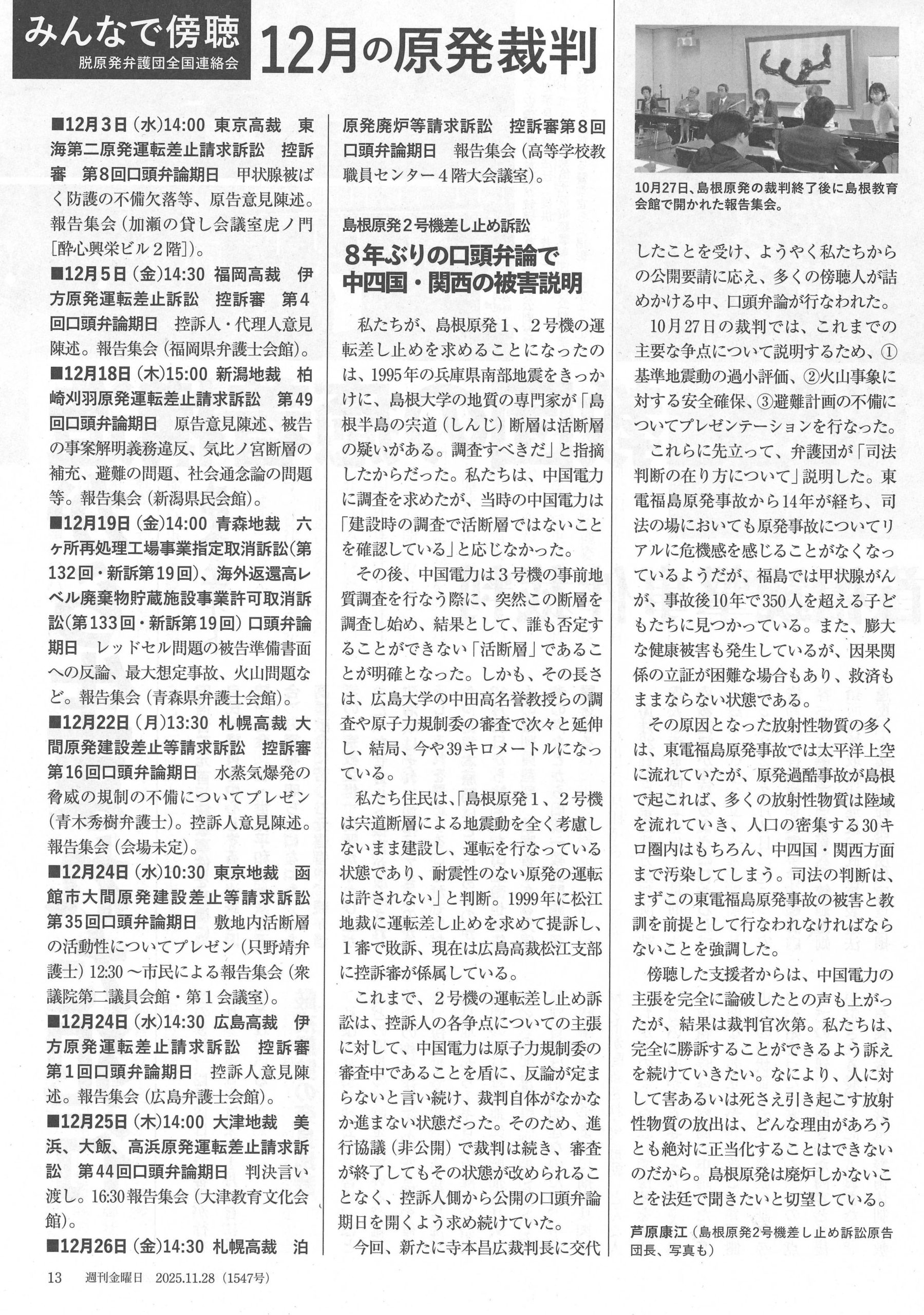週刊金曜日の12月の原発裁判に掲載された、10月28日に開かれた、広島高裁松江支部での島根原発2号機運転差し止め請求訴訟の控訴審第1回口頭弁論期日の報告記事、「島根原発2号機差し止め訴訟 8年ぶりの口頭弁論で中四国・関西の被害説明」について、転載いたします。