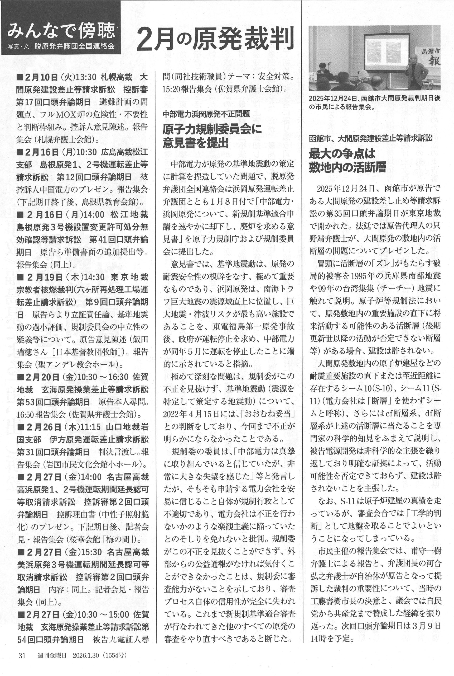 週刊金曜日の2月の原発裁判に掲載された、「函館市 大間原発建設差止等請求訴訟 最大の争点は敷地内活断層」について、転載いたします。