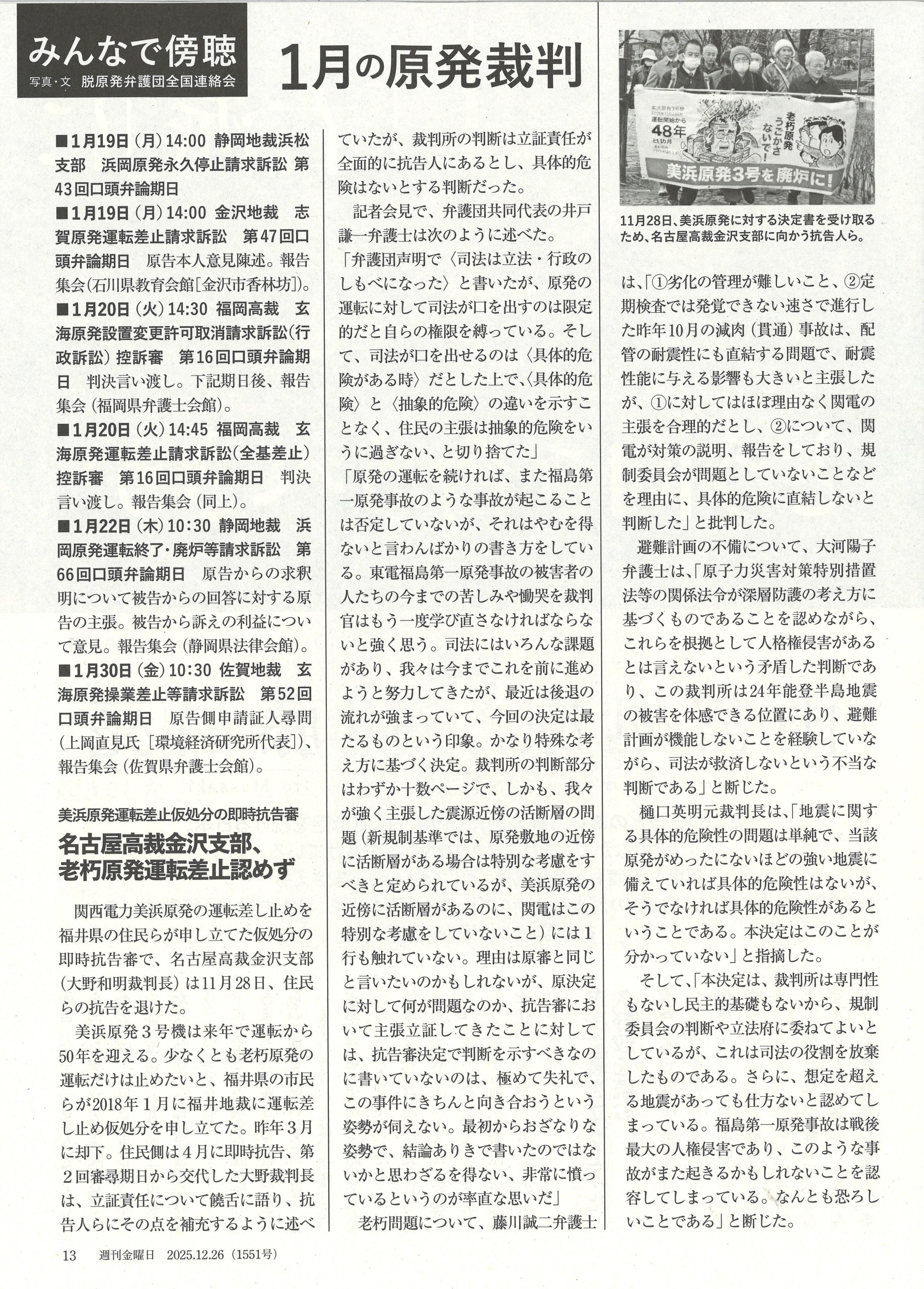 週刊金曜日の1月の原発裁判に掲載された、「美浜原発運転差止仮処分の即時抗告審 名古屋高裁金沢支部 老朽原発運転差し止め認めず」について、転載いたします。
